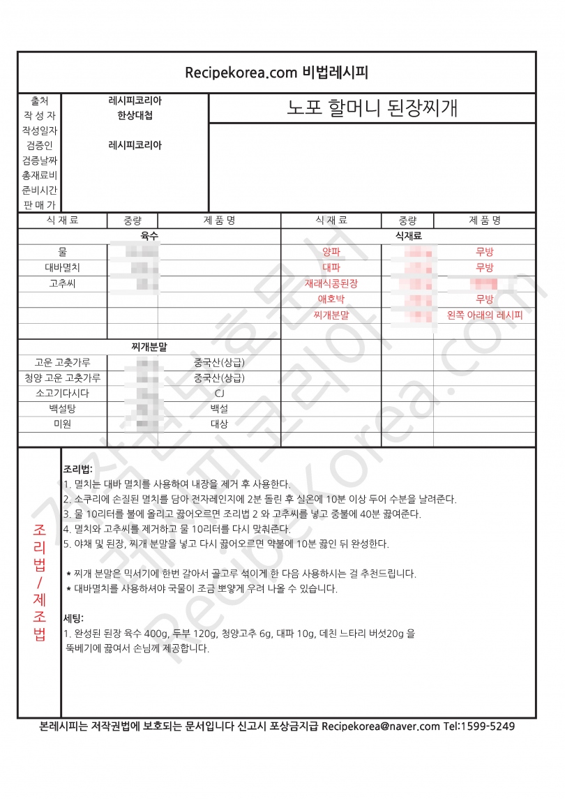 [고기집] 노포 할머니 된장찌개 레시피 전문 맛집 인플루언서도 요청한 레시피 [S79601]